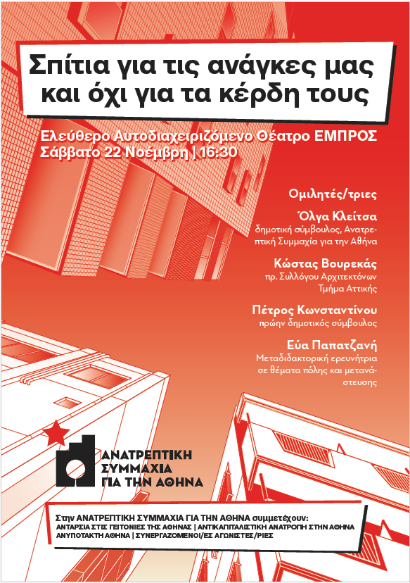 Κάλεσμα σε εκδήλωση της Ανατρεπτικής Συμμαχίας για την Αθήνα με τίτλο: Σπίτια για τις ανάγκες μας και όχι για τα κέρδη τους!